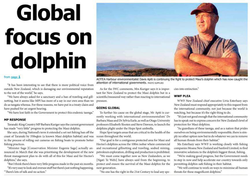 The Māori, the indigenous people of New Zealand, view the Māui dolphin as a “taonga” (treasure) and have been challenging the government’s handling of Māui conservation. Davis Apiti of Ngati Te Wehi says, “In the past 15 years, Ngati Te Wehi has been to protect this special taonga and it feels like it has been falling on deaf ears. There seems to be lots of stakeholder meetings, consultation hui and still the dolphins are declining. It has been interesting to see that there is more political voice from outside New Zealand, which is damaging our environmental reputation to the rest of the world. We have always asked for a sanctuary and a ban of trawling and gillnetting but it seems like MPI has more of a say in our own area than we do as tangata whenua. For these reasons, that is why we have put in a treaty claim and have pushed for an urgent hearing. We have lost faith in the government to protect this endemic taonga.” In May of 2016 the New Zealand High Court rejected a challenge over the government’s handling of Māui dolphin conservation by Ngati Te Wehi and Ngati Tahinga, two Maori communities.