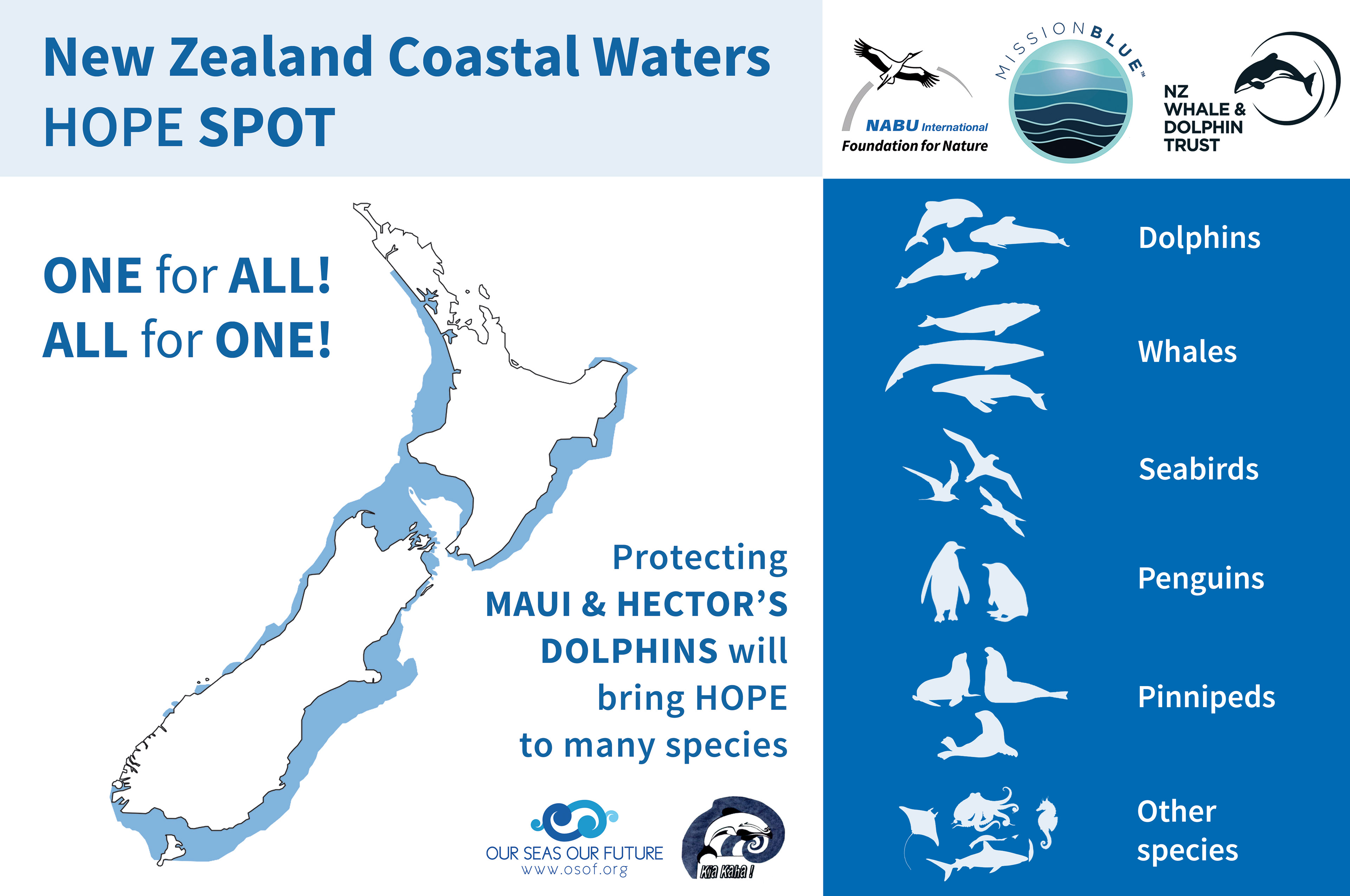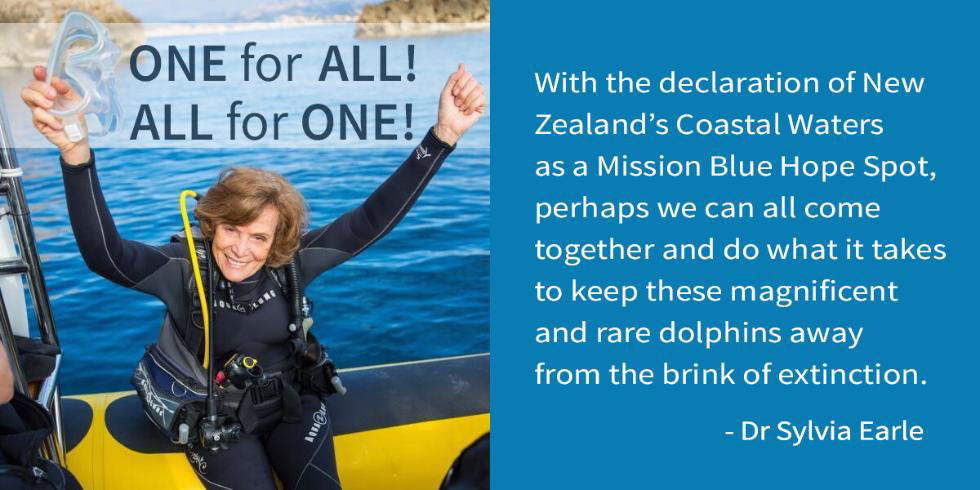 “We only have one chance to get it right with the Hector’s and Māui dolphins – and that time is now,” said Dr Sylvia Earle. “With the declaration of New Zealand’s Coastal Waters as a Mission Blue Hope Spot, perhaps we can all come together and do what it takes to keep these magnificent and rare dolphins away from the brink of extinction.”